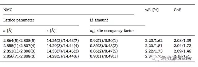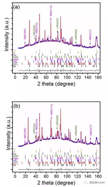 在高分辨率中子衍射技術(shù)的幫助下,Po-Han Lee對完全充電狀態(tài)和完全放電狀態(tài)下的電池進(jìn)行了原位分析,結(jié)果如下圖所示,可以看到充電狀態(tài)下,LMO晶體的a值,以及NMC晶體的a值和c值都和新電池幾乎一直,但是在完全放電的狀態(tài)下LMO和NMC的a值要小于新電池的值,但是NMC材料的c值卻要高于新電池(活性Li 的損失),LMO材料a值減小主要是因為在較高的電勢下儲存導(dǎo)致的Mn2+元素的溶解引起的活性LMO材料損失造成的。