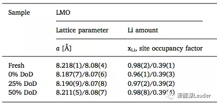 Po-Han Lee根據(jù)中子衍射結(jié)果得出的不同放電深度的電池總正極材料的晶格結(jié)構(gòu)變化和Li含量的變化,從下表中可以看到25%DOD(75%SoC)電池在存儲過程中活性Li和NMC的損失最為嚴(yán)重,并且LMO的損失也較為嚴(yán)重。而在0%DOD(100%SoC)電池在存儲后LMO材料的a值下降最為嚴(yán)重,這意味著在存儲的過程中LMO材料的損失也最為嚴(yán)重,而活性Li和NMC的損失僅次于25%DOD(75%SoC)的電池。