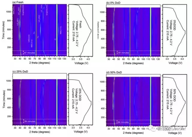 Po-Han Lee采用的中子衍射技術(shù)能夠幫助我們了解上述的三種原因在鋰離子電池存儲容量衰降中所占的比重,幫助我們更好的進(jìn)行針對性的設(shè)計。Po-Han Lee研究中所采用的電池正極為iNi0.5Mn0.3Co0.2O2(NMC532)和Li1.1Mn1.9O4(LMO)的混合體系,負(fù)極采用了石墨材料,電池容量為2.2Ah。這些電池被放電至不同的放電深度DOD,然后在60℃下分別存儲1,2,4,6個月。