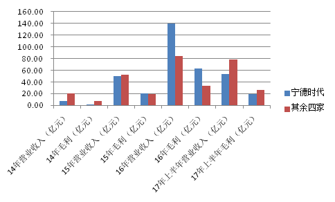 構(gòu)成寧德時代營業(yè)收入主要組成部分來自于動力電池系統(tǒng)的銷售,如果將這家公司該部分經(jīng)營情況與目前已經(jīng)上市的四家公司——國軒高科(002074.SZ)、沃特瑪借殼的堅瑞沃能(300116.SZ)、億緯鋰能(300014.SZ)以及成飛集成(002190.SZ)相比,無論是從動力電池項目的營業(yè)收入還是相應(yīng)的毛利水平來看,均可以說是“四英戰(zhàn)呂布”的局面(比亞迪生產(chǎn)的動力電池多數(shù)自用,未納入比較范疇)。