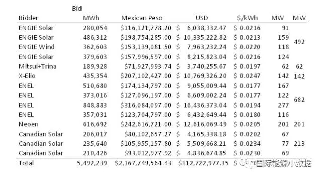 中國儲能網(wǎng)訊:墨西哥能源部2.3吉瓦/5.5TWh(55億度, 2020年入網(wǎng))光伏采購競標結(jié)果日前出爐,意大利ENEL綠色電力公司報價1.77美分/千瓦時(相當于人民幣0.11元/千瓦時),刷新不久前沙特阿拉伯1.79美分/千瓦時的光伏報價最低紀錄。在這次墨西哥的光伏項目競標中,其他公司(也包括中國公司)的平均報價為2.05美分/千瓦時。