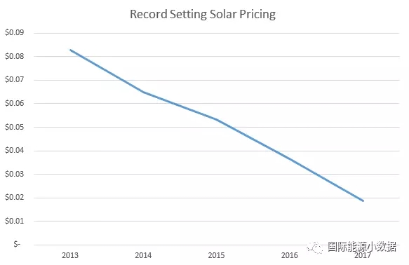 自從2013年美國光伏項目報出8.3美分/千瓦時的最低價格以來,光伏最低價不斷被刷新:2014年阿聯(lián)酋項目報4.97美分/千瓦時;2015年沙特項目報4.97美分/千瓦時;2016年在沙特再度報出2.42美分/千瓦時。到目前為止,2017年在全世界各地的光伏競標中已經(jīng)有7個項目的報價低于2016年的最低報價。有國際專家預計,按目前光伏成本趨勢,2019年光伏最低報價可低至1美分/千瓦時。