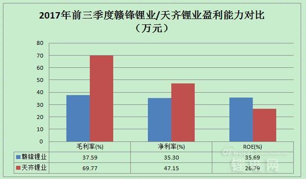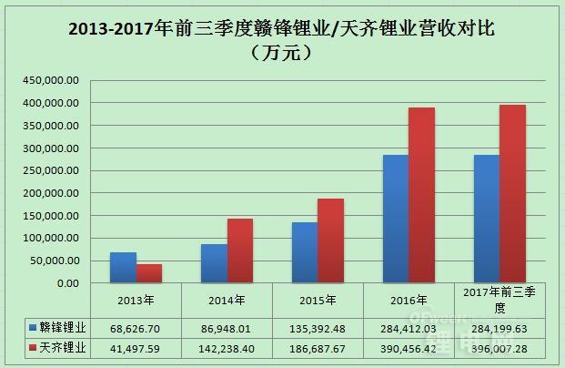 2013年天齊鋰業(yè)的營收比贛鋒鋰業(yè)稍低,但從2014年開始,天齊鋰業(yè)營收節(jié)節(jié)攀升,近四年天齊鋰業(yè)的營收均超過贛鋒鋰業(yè)。2017年前三季度,贛鋒鋰業(yè)實(shí)現(xiàn)營收284,199.63萬元,同比增長40.51%,天齊鋰業(yè)實(shí)現(xiàn)營收396,007.28萬元,同比增長42.96%。
