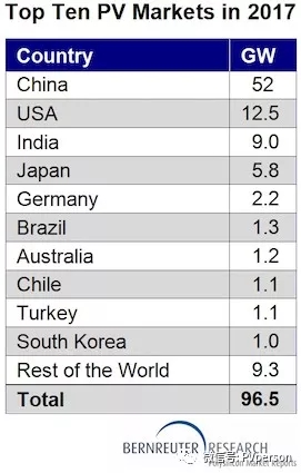 Bernreuter Research得到85個國家自下而上的光伏需求評估的支持,預(yù)計2017年全球安裝量為96.5GW,比2016年的超過74GW增長30%。另一個指標是同樣的方向:通過從四大模塊供應(yīng)商晶科,阿特斯,晶澳太陽能和韓華Q電池的總體出貨指導(dǎo)中推算出全球需求,貝納特勒研究在2017年得出了類似的結(jié)果。