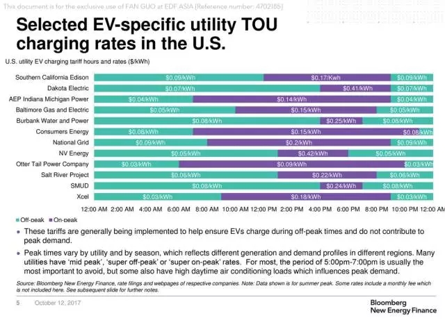 (美國部分電廠針對電動汽車推出的分時電價:峰時時段普遍包括下午4點到下午6點)