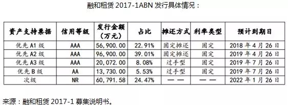 截至2017年4月1日,資產(chǎn)池的初始本金金額為25.60億元,未償本金金額為24.84億元。最大的單筆基礎(chǔ)資產(chǎn)剩余未償租金占比為14.90%,最大的單個客戶剩余未償租金占比為14.90%,因此沒有個別大戶租賃資產(chǎn)占比較高的現(xiàn)象。