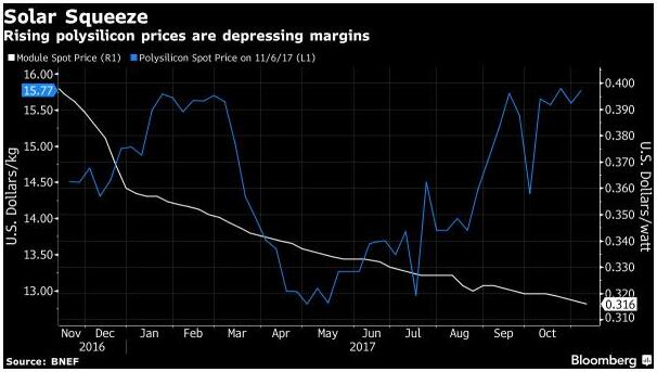 根據位于加拿大太陽能公司Canadian Solar的數據顯示,這兩起事件導致多晶硅短缺,中國多晶硅價格在過去四個月中從每公斤14美元上漲到19美元。
