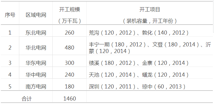 "十二五"期間,抽水蓄能電站核準(zhǔn)開(kāi)工規(guī)模呈現(xiàn)明顯增長(zhǎng)趨勢(shì)。"十二五"前四年,累計(jì)開(kāi)工11座電站,總規(guī)模1460萬(wàn)千瓦。特別是2014年,核準(zhǔn)開(kāi)工抽水蓄能電站5座,規(guī)模660萬(wàn)千瓦,創(chuàng)歷史新高。從分布來(lái)看,"十二五"前四年開(kāi)工的蓄能電站主要分布在華北、華東、華中和東北電網(wǎng),南方電網(wǎng)相對(duì)較少。