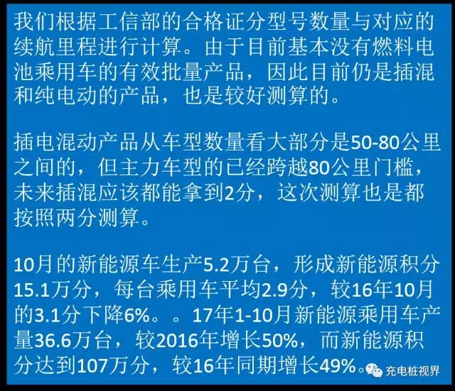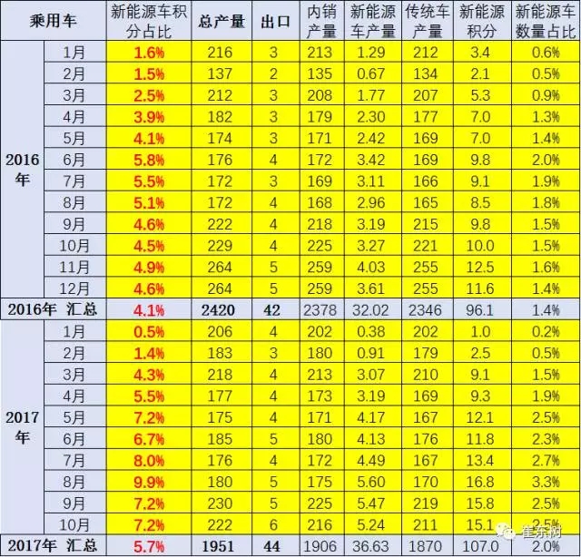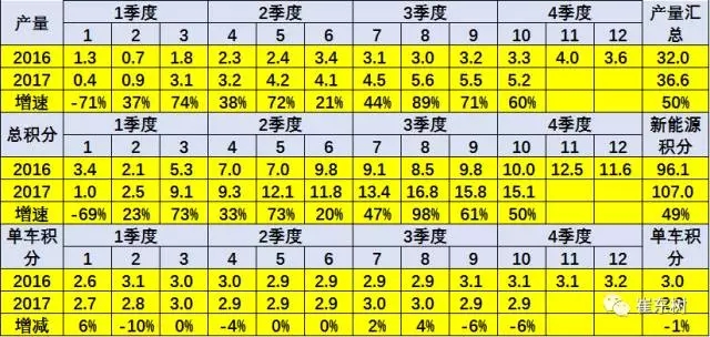 總體看,17年1-10月的新能源汽車積分比例占比達(dá)到5.7%,較16年的4.1%有明顯的提升。而且由于16年是完整的年度,屬于前低后高的特征,例如16年10月是4.5%,而17年10月是7.2%,高出近2.7個(gè)百分點(diǎn),因此17年的實(shí)際提升幅度更大。