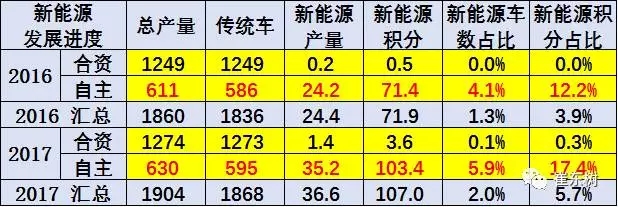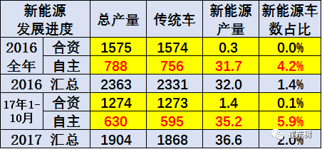 17年1-10月的新能源車銷量占比2%,較16年全年的1.4%有了大幅改善提升。其中 合資企業(yè)的改善較小,17年產(chǎn)量1.4萬(wàn)臺(tái),相對(duì)自主的35萬(wàn)臺(tái),差距不很大。