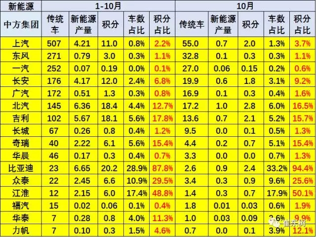 總體看,前三位的上汽、東風(fēng)、一汽的新能源達(dá)標(biāo)壓力最大,嚴(yán)重沒有準(zhǔn)備充分。尤其是一汽和東風(fēng)的新能源占比僅有近乎0, 新能源汽車積分比例也是幾乎為零。這樣的狀態(tài)也導(dǎo)致企業(yè)平均油耗與新能源車雙積分政策有較大實(shí)現(xiàn)難度,政策難以快速推進(jìn)。但上汽逐步加速跟進(jìn),10月的新能源積分達(dá)到3.7%。相信隨著2020年的各家新能源車產(chǎn)品逐步到位,新能源汽車積分比例應(yīng)該能有效實(shí)現(xiàn)。