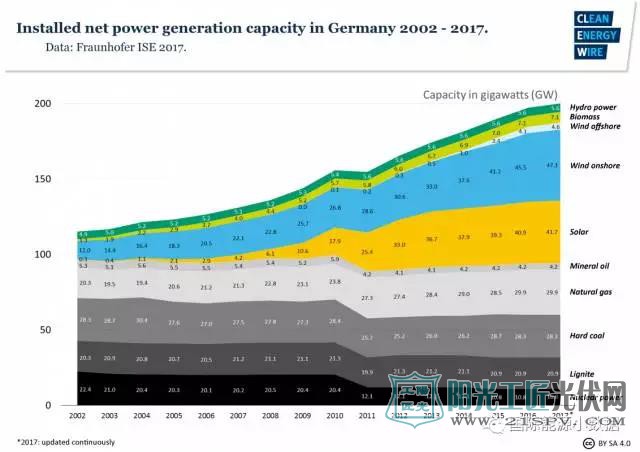 到目前為止,德國2017年發(fā)電裝機容量為200.2吉瓦,其中核電10.8吉瓦(5.4%)、褐煤20.9吉瓦(10.4%)、硬煤28.3吉瓦(14.1%)、天然氣29.9吉瓦(14.9%)、礦物油4.2吉瓦(2.1%)、太陽能41.7吉瓦(20.8%)、陸上風(fēng)電47.1吉瓦(23.5%)、海上風(fēng)電4.6吉瓦(2.3%)、生物質(zhì)7.1吉瓦(3.5%)、水電5.6吉瓦(2.8%)。綜合而言,德國的可再生能源發(fā)電裝機占總裝機容量的53.0%,而煤電裝機占24.6%。