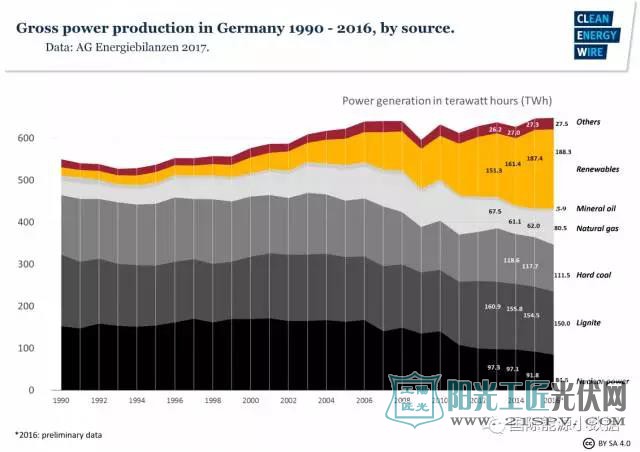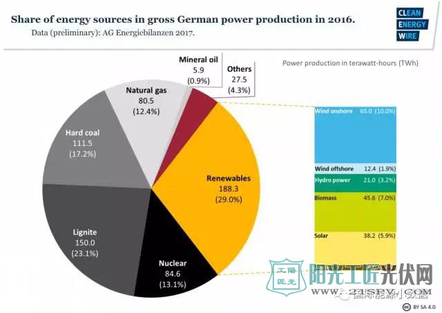 從發(fā)電量來看,2016年德國發(fā)電量為648.3TWh(6483億千瓦時),其中核電84.6TWh(13.0%)、褐煤150.0TWh(23.1%)、硬煤111.5TWh(17.2%)、天然氣80.5TWh(12.4%)、礦物油5.9TWh(0.9%)、可再生能源188.3TWh(29.0%)、其他27.5TWh(4.2%)。綜合而言,德國的可再生能源發(fā)電裝機占總裝機容量的53.0%,但發(fā)電量只占53.0%;而煤電裝機占24.6%,但發(fā)電量占40.3%。