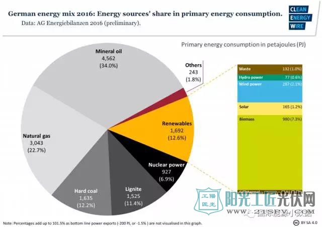 如果看一次能源消費(包括交通、供暖需求),那么2016年煤炭占33.6%、核能6.9%、天然氣22.7%、礦物油34.0%、可再生能源12.6%,其他1.8%。