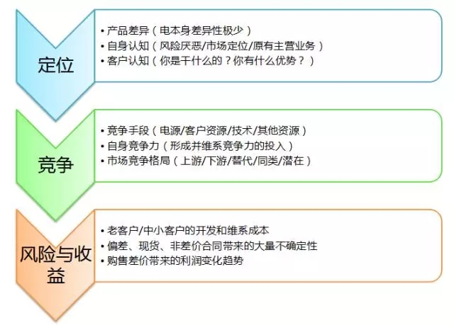 售電公司的分化可以從三個(gè)維度來(lái)分析:一是定位,不同的售電公司有自己的定位,例如是偏向于客戶服務(wù)還是客戶交易。二是競(jìng)爭(zhēng),不同的售電公司因?yàn)楦?jìng)爭(zhēng)的手段和資源不一樣,會(huì)有相應(yīng)的分化,例如有電源和沒(méi)有電源的售電公司就完全不一樣。三是風(fēng)險(xiǎn)和收益。售電公司對(duì)風(fēng)險(xiǎn)的忍耐程度是不一樣的,例如有的售電公司會(huì)認(rèn)為沒(méi)有必要承擔(dān)偏差帶來(lái)的不確定性。