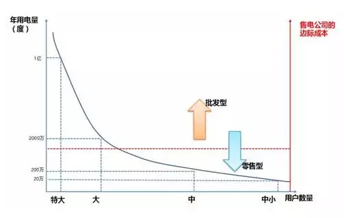 紅色的縱坐標(biāo)代表每一家售電公司新增加一個(gè)售電客戶所需要投入的成本。從廣東的售電市場(chǎng)情況看,對(duì)于大多數(shù)售電公司來(lái)講,不管用戶體量的大小,每跑一個(gè)客戶投入的時(shí)間精力都是差不多的,這是由這根紅色的虛線所確定的。這對(duì)于大的售電公司來(lái)講,用戶數(shù)量到一定程度之后,再去跑中小型的客戶成本就很難承受。所以由于邊際成本的固定,使得未來(lái)售電公司會(huì)有一個(gè)很明確的選擇,是著重拓展大用戶,以體量取得交易的優(yōu)勢(shì)還是在邊際成本線以下,依靠屬地化的優(yōu)勢(shì),降低邊際成本,以客戶數(shù)量取勝?這個(gè)選擇就會(huì)帶來(lái)售電公司的分化,即批發(fā)型售電公司和零售型售電公司的分化。