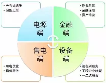 從產(chǎn)業(yè)鏈的角度看,光靠單一的服務(wù)項(xiàng)目是很難去跟客戶溝通的,用戶需要的是一攬子的解決方案,這就帶來(lái)市場(chǎng)的價(jià)值發(fā)現(xiàn)和重新整合的機(jī)會(huì)。這包括:一、電源端的布局,例如分布式、儲(chǔ)能的布局和運(yùn)維。二、金融端,例如設(shè)備租賃、設(shè)備保險(xiǎn)。三、售電端,例如用電優(yōu)化、增值服務(wù)等。四、設(shè)備端,包括設(shè)備服務(wù)、工程企業(yè)轉(zhuǎn)型、一二次融合等。需要對(duì)這四個(gè)環(huán)節(jié)進(jìn)行整合。
