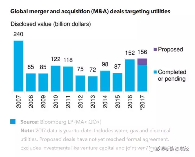 2017年,已披露的電廠收購項目總規(guī)模為1559億美元,達(dá)到了2007年以來最高水平。該數(shù)字包括大約300億美元的“擬議”交易,即目前仍處于初步階段或媒體報道可能成型的交易。然而,即使剔除這部分“擬議”交易,2017年的交易總規(guī)模也已接近2016年的全年水平。