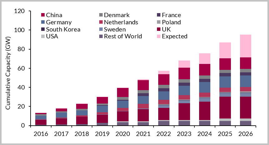 2017年,全球累計海上風(fēng)電裝機(jī)容量約為17.8吉瓦,預(yù)計到2026年這一數(shù)據(jù)將增至95.2吉瓦。