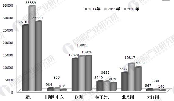 從全球風(fēng)電新增裝機(jī)容量的區(qū)域分布來(lái)看,亞洲地區(qū)風(fēng)電新增裝機(jī)容量最多,其次為歐洲地區(qū),北美洲排在第三位。2016年,亞洲地區(qū)風(fēng)電新增裝機(jī)容量為27680MW,歐洲地區(qū)風(fēng)電新增裝機(jī)容量為13926MW,北美洲地區(qū)風(fēng)電新增裝機(jī)容量為9359MW。
