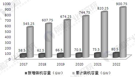 2017-2022年全球風(fēng)電新增和累計(jì)裝機(jī)容量預(yù)測(cè)(單位:GW)