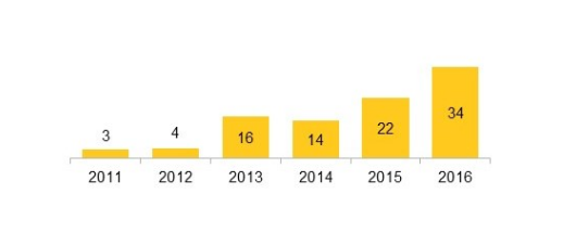 在34GW的總裝機(jī)量中,中國(guó)的新增光伏容量占27GW,增幅遠(yuǎn)超世界任何其他國(guó)家。不過(guò),中國(guó)以外的其他發(fā)展中國(guó)家的光伏裝機(jī)也出現(xiàn)了強(qiáng)勁增長(zhǎng),印度的新增裝機(jī)達(dá)4.2GW。與此同時(shí),2016年,巴西、智利、約旦、墨西哥、巴基斯坦及其他9個(gè)國(guó)家的累積光伏容量均增加了1倍以上。總的來(lái)說(shuō),2016年,光伏在Climatescope研究國(guó)家新增發(fā)電裝機(jī)中的比例為19%,較2015年的10.6%和2011年的2%有所提高。