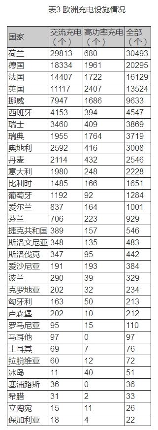 直流充電設(shè)施情況如下圖所示,數(shù)量過千的國(guó)家只有五個(gè):英國(guó)、德國(guó)、瑞典、法國(guó)和挪威。這也暴露出非?,F(xiàn)實(shí)的問題,即區(qū)域發(fā)展并不平衡,表3數(shù)據(jù)顯示,歐洲發(fā)展電動(dòng)汽車也分為三個(gè)等級(jí):非常積極、普通和消極三個(gè)梯隊(duì),這與歐洲電動(dòng)汽車銷量也有直接的相關(guān)性。