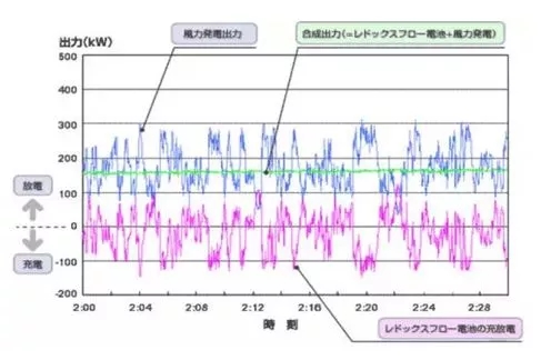 舉一個例子,上圖是日本的某個實驗:圖中曲線是某風(fēng)機半夜兩點時段的發(fā)電輸出,可以看到這個風(fēng)力發(fā)電不是那么穩(wěn)定,最高超過300千瓦,最低不到50千瓦。這是風(fēng)機發(fā)電的特點,可能會對電網(wǎng)造成很大的問題。但如果有儲能裝置,發(fā)電多時將多余電存起來作為負載,發(fā)電少時往外放電,長此以往,計算出一個預(yù)估值,判斷多大風(fēng)發(fā)多少電,根本解決風(fēng)能、太陽能發(fā)電的不穩(wěn)定、不連續(xù)性特性,實現(xiàn)安全、穩(wěn)定供電。