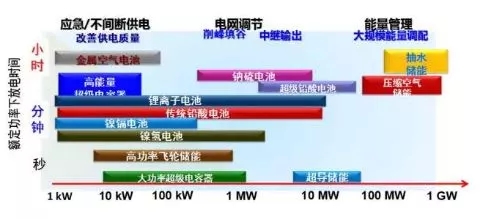 我們所說的大規(guī)模儲能技術(shù),如圖中三角區(qū)域所示,時間長、功率大,屬于電網(wǎng)的儲能技術(shù)。如抽水儲能、壓縮空氣儲能、鈉硫電池、鉛炭電池等。