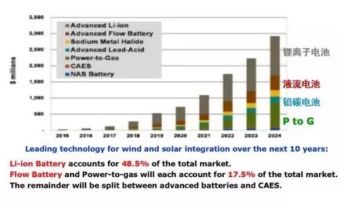 上圖是一個叫Navigant的咨詢公司2015年對儲能技術(shù)的預(yù)測。上圖顯示了該公司認為的今后哪些儲能會主導(dǎo)。具體的百分比我不太相信,但其趨勢我比較認可。除了鋰離子、液流電池、歐洲還有一個P to G(Power-to-Gas)技術(shù)。我個人認為,從中期看,儲能的這三種技術(shù)是比較好的。