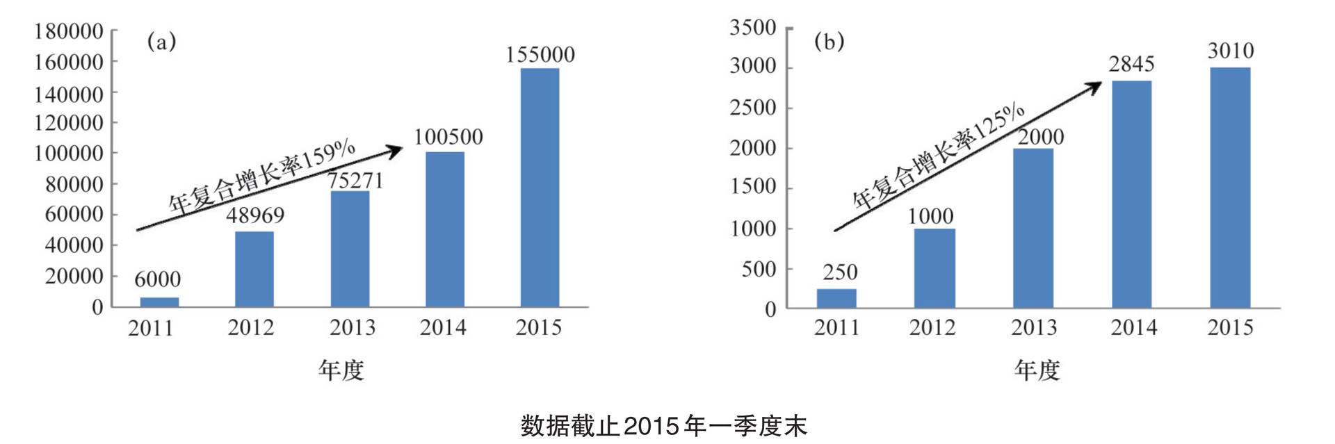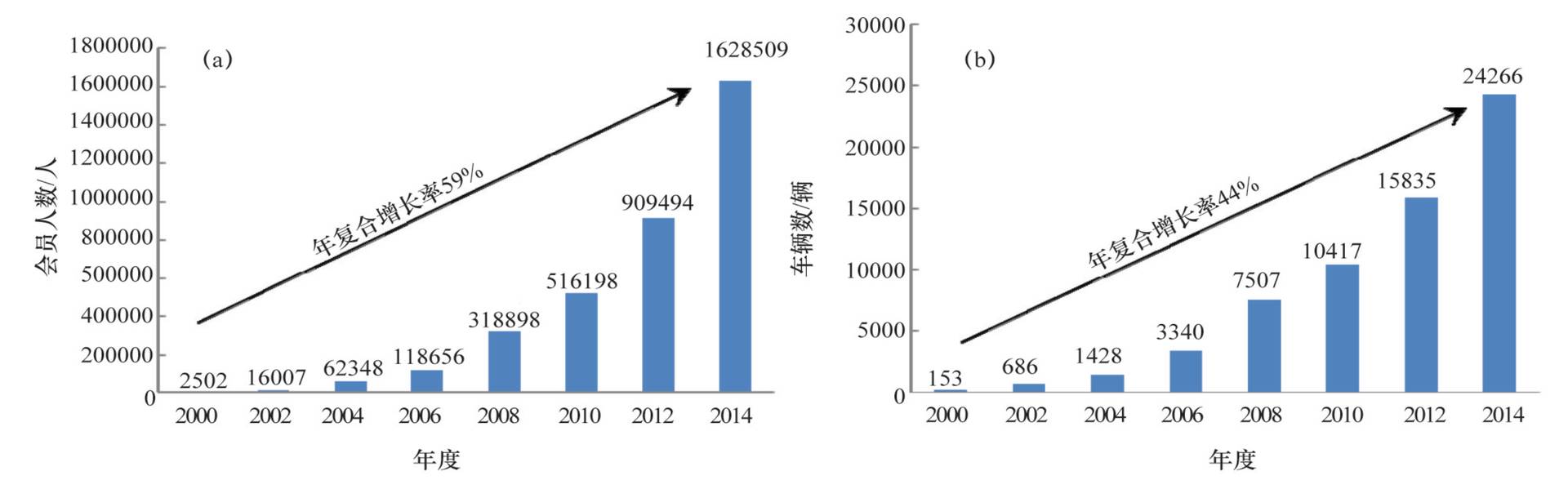 圖 2 北美地區(qū) 2000-2014 年汽車共享會員人數(shù)(a)和車輛數(shù)(b)增長情況