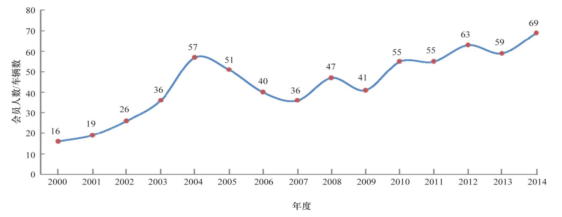 圖 3 北美地區(qū) 2000-2014 年汽車共享會員人數(shù)與車輛數(shù)比值分布