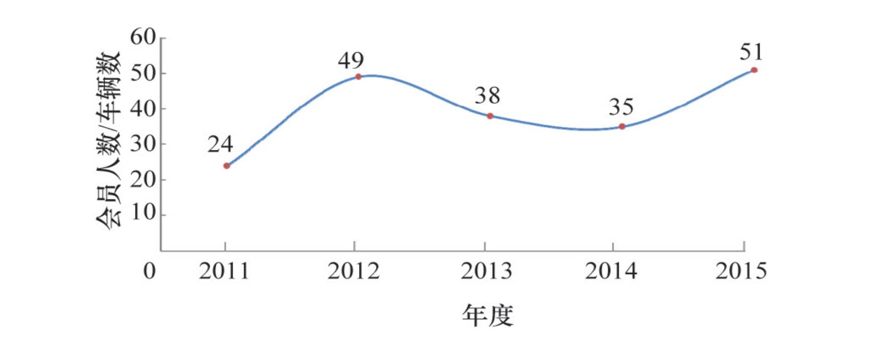 圖 5 法國博洛雷公司 AUTOLIB 項(xiàng)目 2011-2015 年汽車共享會員人數(shù)與車輛數(shù)比值分布