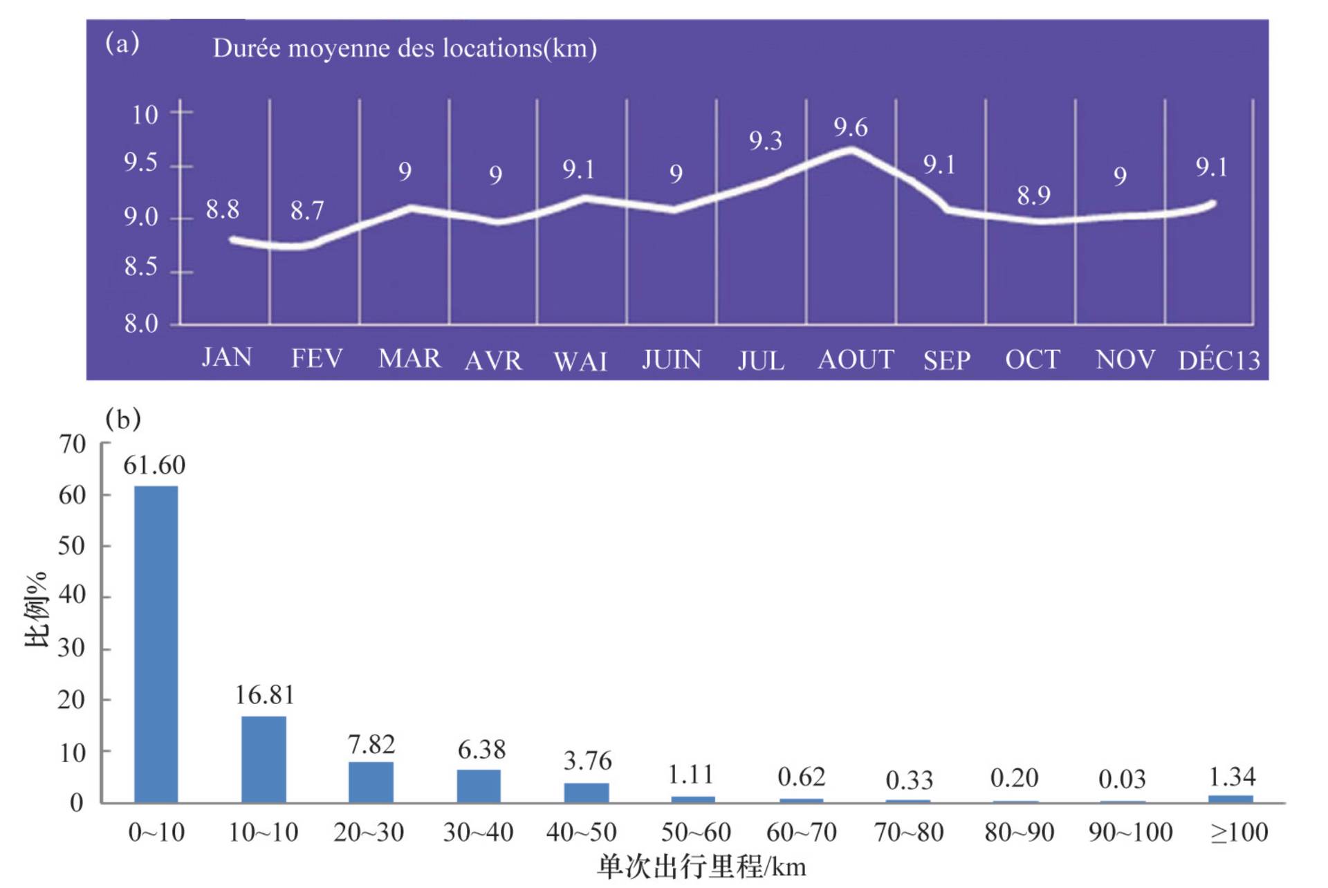 圖 9 AUTOLIB 用戶單次平均行駛里程月度分布(a)與 EVCARD 用戶單次行駛里程分布(b)