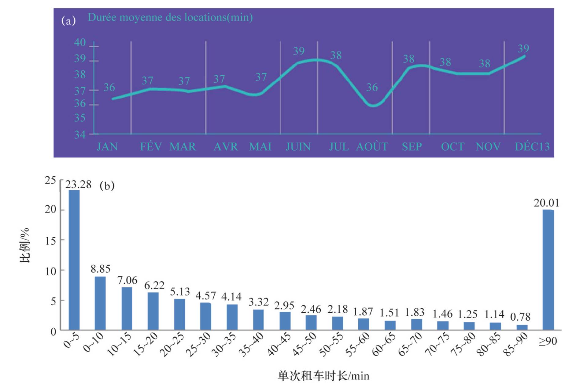 圖 10 AUTOLIB 用戶單次平均行駛時間月度分布(a)及 EVCARD 用戶單次租車時間分布(b)