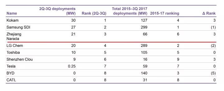 彭博社2017年前三季度儲能投運規(guī)模榜單,主要根據企業(yè)近期投運的儲能項目規(guī)模進行排名。