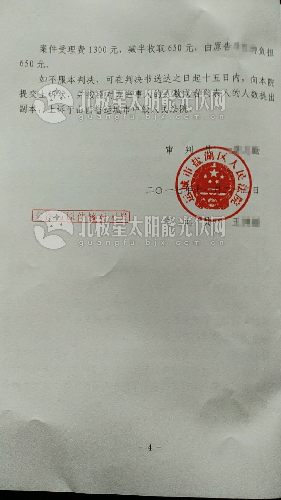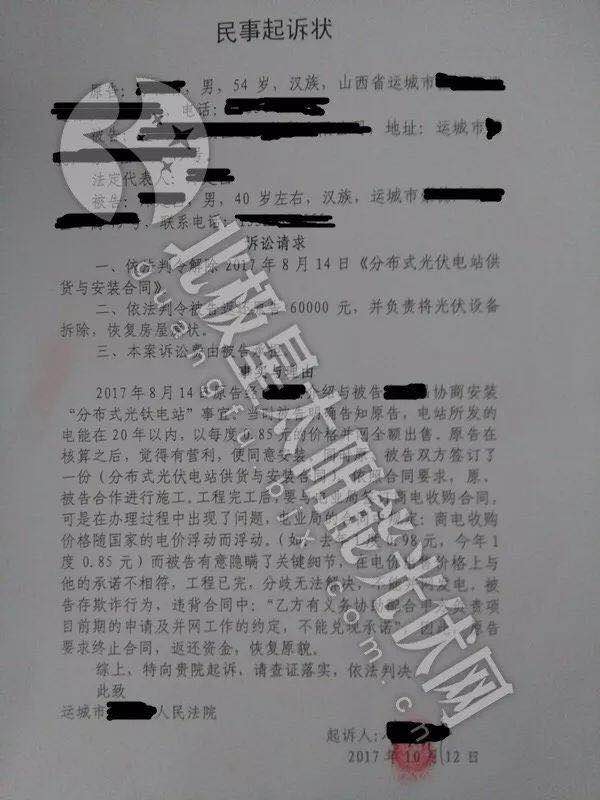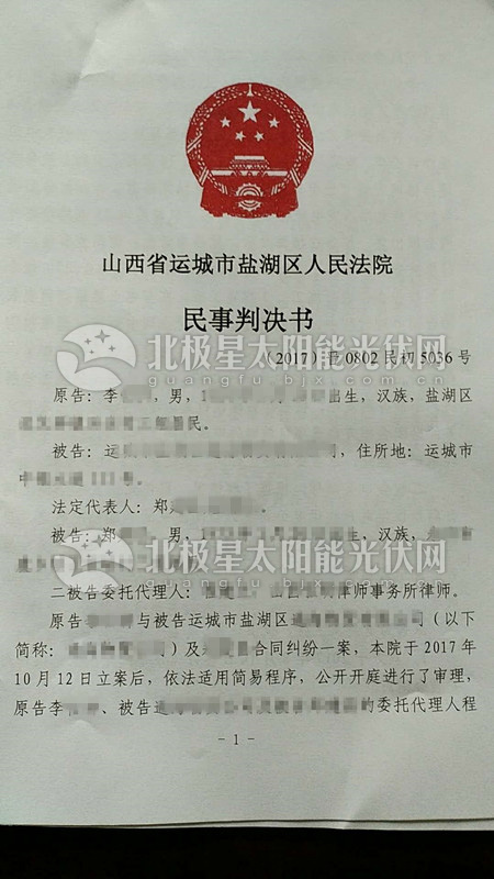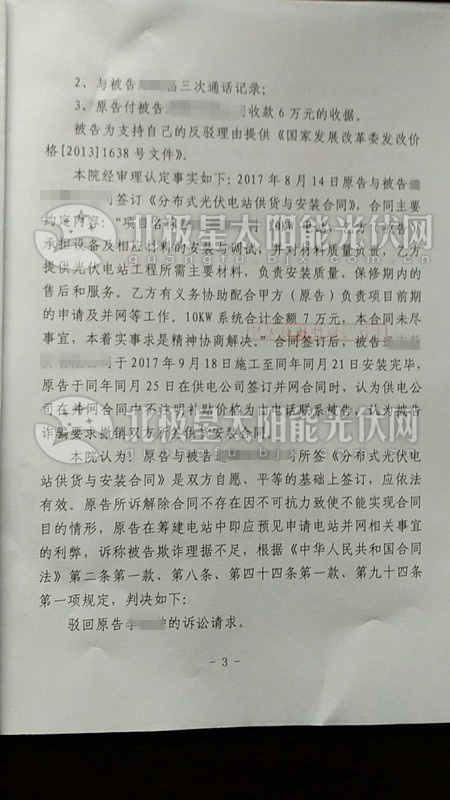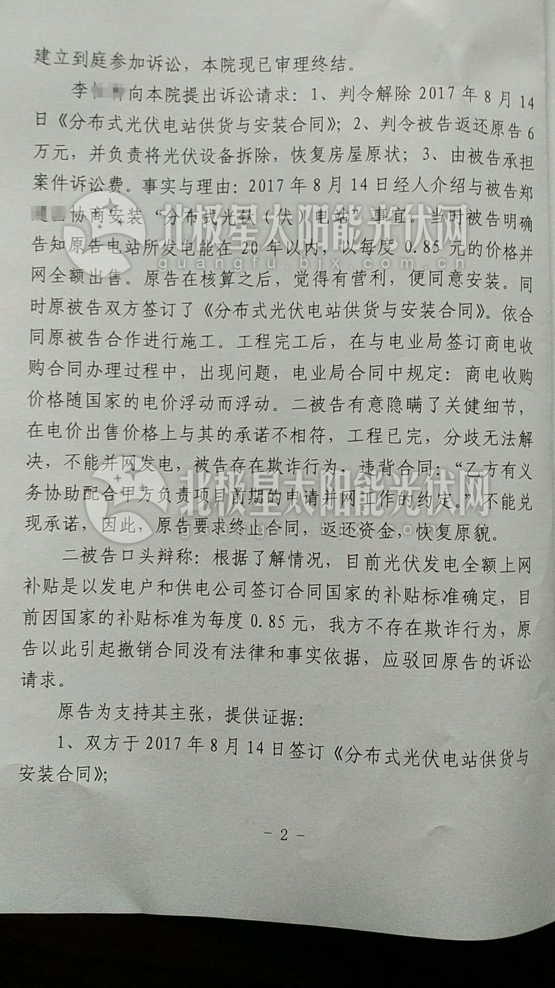 該案件的爭議和核心在于,用戶李某看到與電業(yè)局簽訂的發(fā)用電合同中沒有寫明光伏電價補貼標準事宜,“聽說0.85元的度電補貼會隨著國家政策的調(diào)整而變化,并不能保證20年不變,心生顧慮才反悔?!币虼?,李某將光伏經(jīng)銷商鄭某以欺詐理由告上了山西運城鹽湖區(qū)人民法院。(可參考此前報道《一紙傳票,山西某光伏經(jīng)銷商被告上法庭!》)