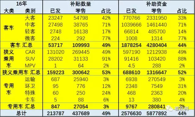 16年當(dāng)年零售的新能源車目前統(tǒng)計(jì)是43.7萬臺(tái),補(bǔ)貼的21.3萬臺(tái)占49%。其中的客車補(bǔ)貼車型占全部銷售車型的49%,而乘用車是53%,這也是嚴(yán)重的乘用車補(bǔ)貼發(fā)放較慢的問題。3萬公里的乘用車影響太大。