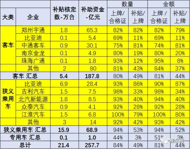 而乘用車中的比亞迪和江淮的補(bǔ)貼獲取能力較強(qiáng),其他企業(yè)的分化差異較大。江淮的合格證生產(chǎn)車型100%上牌,而且已經(jīng)有80%拿到補(bǔ)貼,應(yīng)該是運(yùn)作最規(guī)范的。比亞迪也是上牌車型基本87%都拿到補(bǔ)貼。