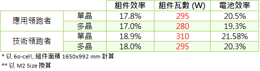 領(lǐng)跑者計(jì)劃實(shí)際上僅制定組件瓦數(shù)的門坎,因此業(yè)者除了在電池技術(shù)上提升外,亦可透過半切、雙面電池等技術(shù)來撐高瓦數(shù)表現(xiàn)。