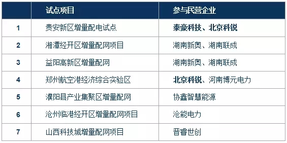 在國家電網(wǎng)經(jīng)營區(qū)域內(nèi),也產(chǎn)生了首家非國網(wǎng)控股的增量配電網(wǎng)業(yè)務試點項目產(chǎn)生,該項目是山西科技城綜合能源供應試點項目,由國家電網(wǎng)、管委會政府和社會資本共同成立,其中國家電網(wǎng)占股49%;民營企業(yè)協(xié)鑫參與的三個增量配網(wǎng)項目(安徽金寨、河南濮陽、江蘇揚中)均與國家電網(wǎng)所屬公司合作。