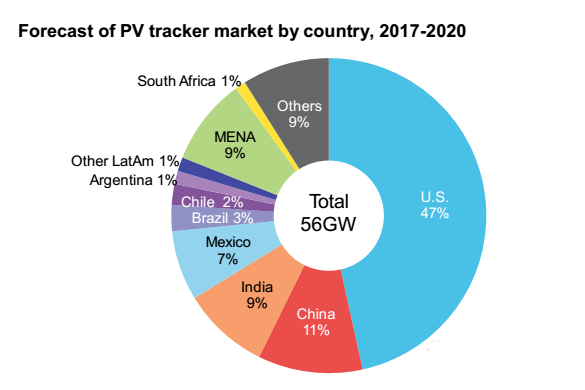 在彭博社的報(bào)告中指出,2016年全球太陽能跟蹤支架總出貨量24.7GW,其中美國占78%,其它國家共占22%,而在2017年美國占比59%,其它國家共同占比41%,隨著本土政府向光伏的傾斜,光照資源好的地區(qū)如拉美、中東、非洲都將成為太陽能跟蹤系統(tǒng)的新興市場,主要集中在墨西哥、巴西、智利、阿根廷、約旦等國。