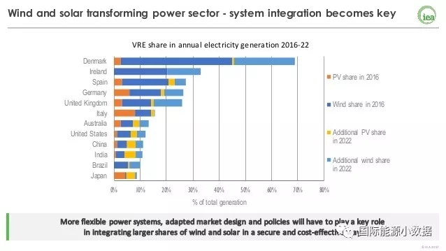 根據(jù)國際能源署(IEA)在最新版的世界能源展望中的情景分析,2022年各國間歇性可再生能源(風(fēng)電、光伏)發(fā)電的比例可望達到以下的規(guī)模: