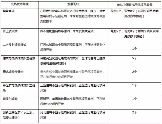 共10余種細分技術(shù)路線參與了首批示范項目申報,其中不乏一些創(chuàng)新型技術(shù)方案。最終入選的共有熔鹽塔式、水工質(zhì)塔式、二次反射熔鹽塔式、槽式導(dǎo)熱油傳熱熔鹽儲熱、槽式熔鹽傳儲熱、菲涅爾導(dǎo)熱油傳熱熔鹽儲熱、菲涅爾熔鹽傳儲熱、創(chuàng)新型菲涅爾(水工質(zhì)加混凝土儲熱)等八種技術(shù)路線入選。