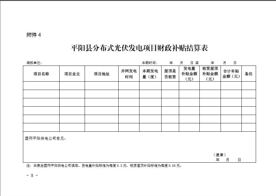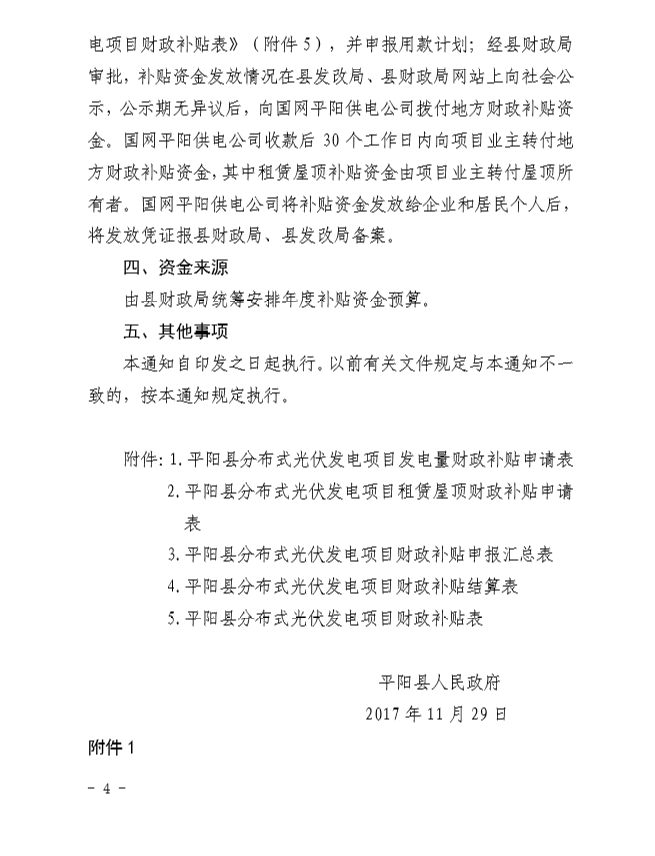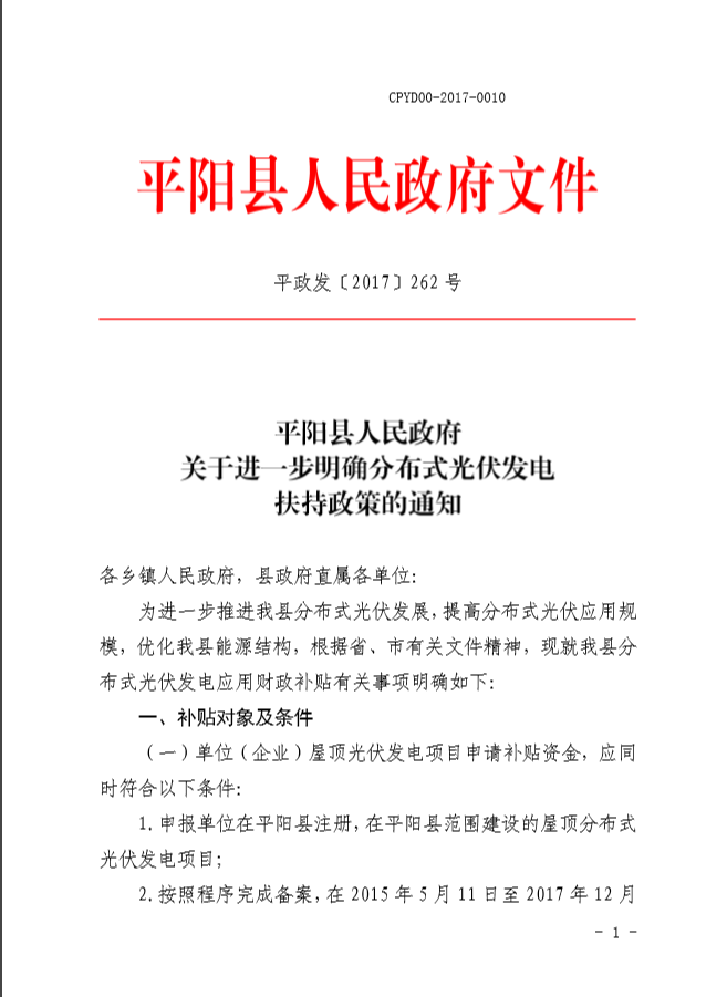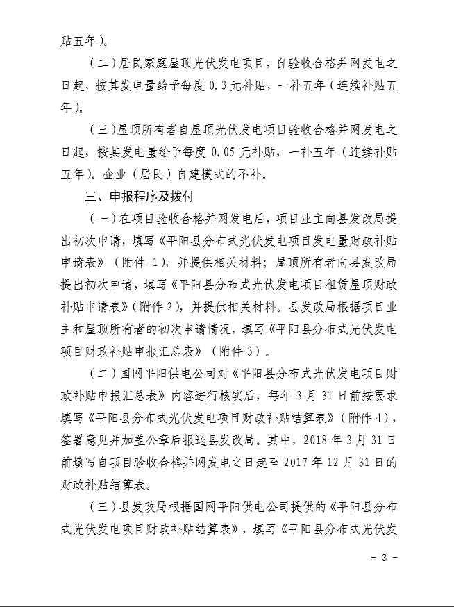 中國儲能網訊:近日,浙江省平陽縣人民政府引發(fā)了《關于進一步明確分布式光伏發(fā)電扶持政策的通知》,指出單位(企業(yè))屋頂光伏發(fā)電項目和居民家庭屋頂光伏發(fā)電項目,按其發(fā)電量給予每度 0.3 元補貼;屋頂所有者自屋頂光伏發(fā)電項目按其發(fā)電量給予每度 0.05 元補貼,所有項目都是連續(xù)補貼五年。企業(yè)(居民)自建模式的不補。