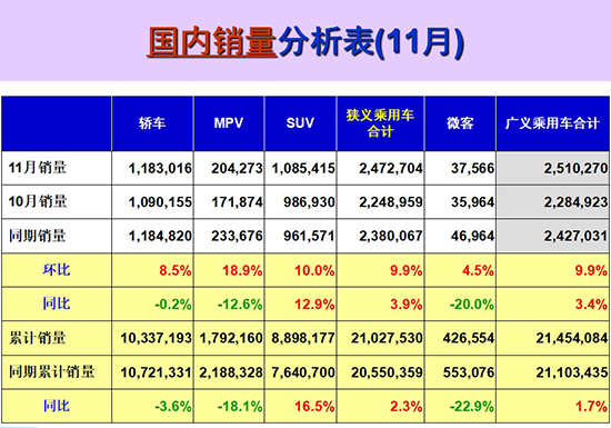 其中,SUV車型雖仍然保持同環(huán)比雙增長,但其增速已現(xiàn)放緩趨勢。11月,SUV車型共銷售1085415輛,環(huán)比增長10.0%,同比增速則連續(xù)3個月出現(xiàn)下滑走勢,本月下滑至12.9%的同比增速也拖累全年累計增幅下滑至16.5%。不過,11月,SUV車型銷量僅落后轎車銷量97601輛,完成對轎車銷量的超越指日可待。
