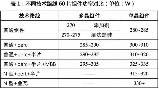傳統(tǒng)普通多晶組件功率為270W,普通單晶組件功率為285W,功率差為15W;當(dāng)各自疊加一系列新技術(shù)以后,功率差會(huì)進(jìn)一步拉大。2018年各種技術(shù)路線的組件功率分布如表1所示。