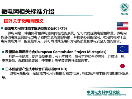 赫衛(wèi)國(guó)主任首先梳理了不同國(guó)家關(guān)于微電網(wǎng)的定義,美國(guó)電力可靠性技術(shù)解決方案協(xié)會(huì)(CERTS)認(rèn)為,微電網(wǎng)是一種由負(fù)荷和微電源共同組成的系統(tǒng)。它可同時(shí)提供電能和熱量。微電網(wǎng)內(nèi)部的電源主要由電力電子器件負(fù)責(zé)能量的轉(zhuǎn)換,并提供必要的控制。微電網(wǎng)相對(duì)于主電網(wǎng)表現(xiàn)為單一的受控單元,并可同時(shí)滿足用戶對(duì)電能質(zhì)量和供電安全方面的需求。而歐盟微電網(wǎng)項(xiàng)目協(xié)會(huì)(European Commission Project Microgrids) 則認(rèn)為微電網(wǎng)能夠利用一次能源,使用微型電源,分為不可控、部分可控和全控三種,并可冷、熱、電三聯(lián)供。配有儲(chǔ)能裝置,使用電力電子裝置進(jìn)行能量調(diào)節(jié)。日本新能源產(chǎn)業(yè)技術(shù)綜合開(kāi)發(fā)機(jī)構(gòu)(NEDO)將微電網(wǎng)定義為,一定區(qū)域內(nèi)利用可控的分布式電源,根據(jù)用戶需求提供電能的小型系統(tǒng)。