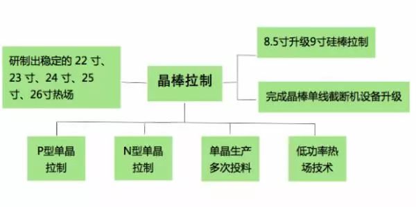 億晶儲(chǔ)備有P型單晶拉制、N型單晶拉制、單晶生產(chǎn)多次投料技術(shù)、低功率熱場(chǎng)技術(shù)等,完成了對(duì)晶棒單線截?cái)鄼C(jī)的設(shè)備升級(jí),開展了8.5寸升級(jí)9寸單晶硅棒的拉制工作。