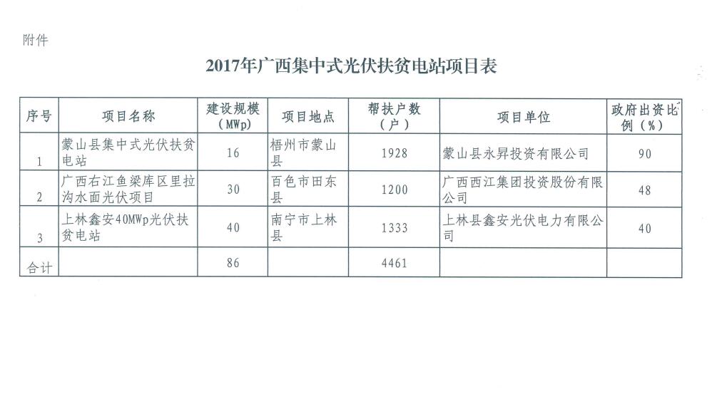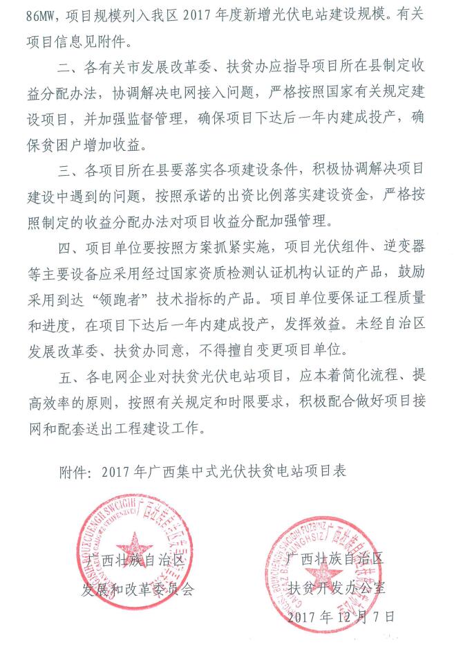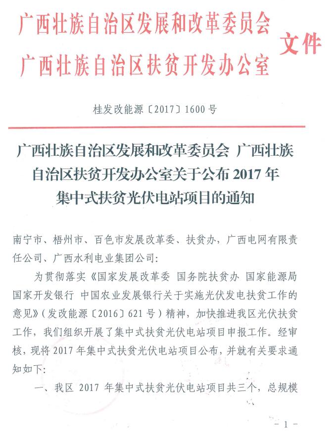 中國(guó)儲(chǔ)能網(wǎng)訊:12月14日,廣西壯族自治區(qū)發(fā)展和改革委員會(huì)廣西壯族自治區(qū)扶貧開(kāi)發(fā)辦公室公開(kāi)發(fā)布了《關(guān)于公布2017年集中式扶貧光伏電站項(xiàng)目的通知 (桂發(fā)改能源〔2017〕1600號(hào))》,詳細(xì)文件如下: